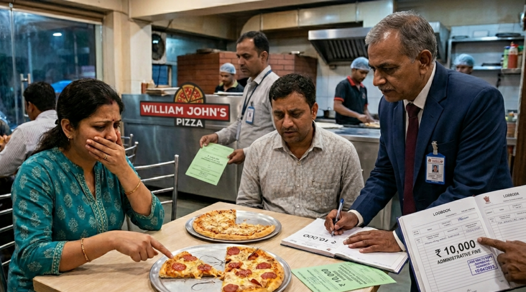અમદાવાદનાં શાહીબાગમાં આવેલ વિલિયમ જોન્સ પિઝા આઉટલેટમાં પિઝા માંથી નીકળ્યો વાળ. અમદાવાદ મ્યુનિસિપલ કોર્પોરેશન (AMC) ના આરોગ્ય વિભાગે શાહીબાગમાં વિલિયમ જોન્સ પિઝા આઉટલેટ પર સ્વચ્છતાની ફરિયાદ બાદ 10,000 રૂપિયાનો દંડ ફટકાર્યો છે. સ્થાનિક રહેવાસી એ શાહીબાગમાં વિલિયમ જોન્સ પિઝા આઉટલેટ પર પીઝા ખાતા જ વાળ મળી આવતાં આ મામલો સામે આવ્યો હતો.